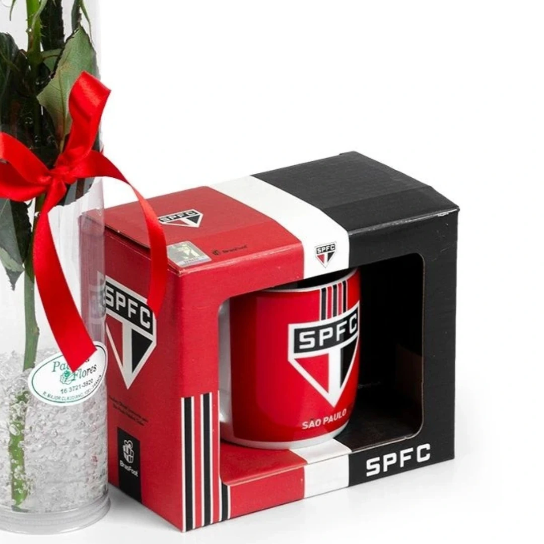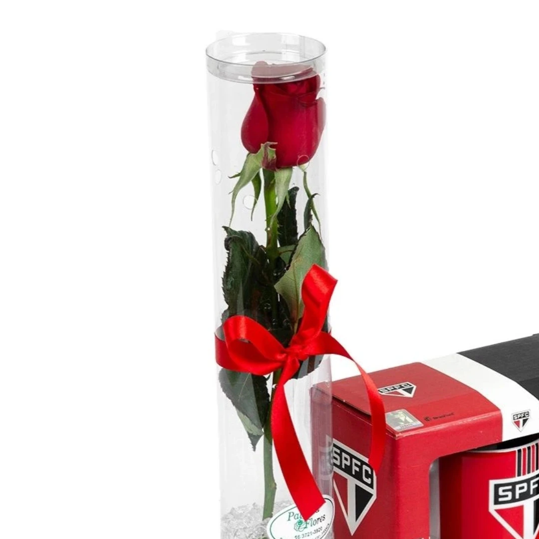 Lindo botão de rosa vermelho embalado em tubo de acetato com gel conservante. Laço em cetim, caneca temática de time ou romântica (a escolher).