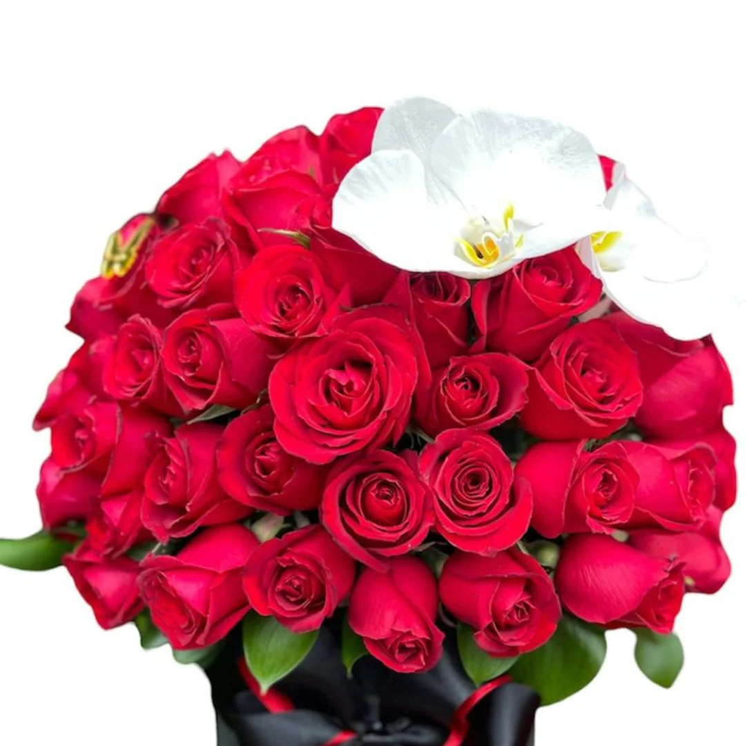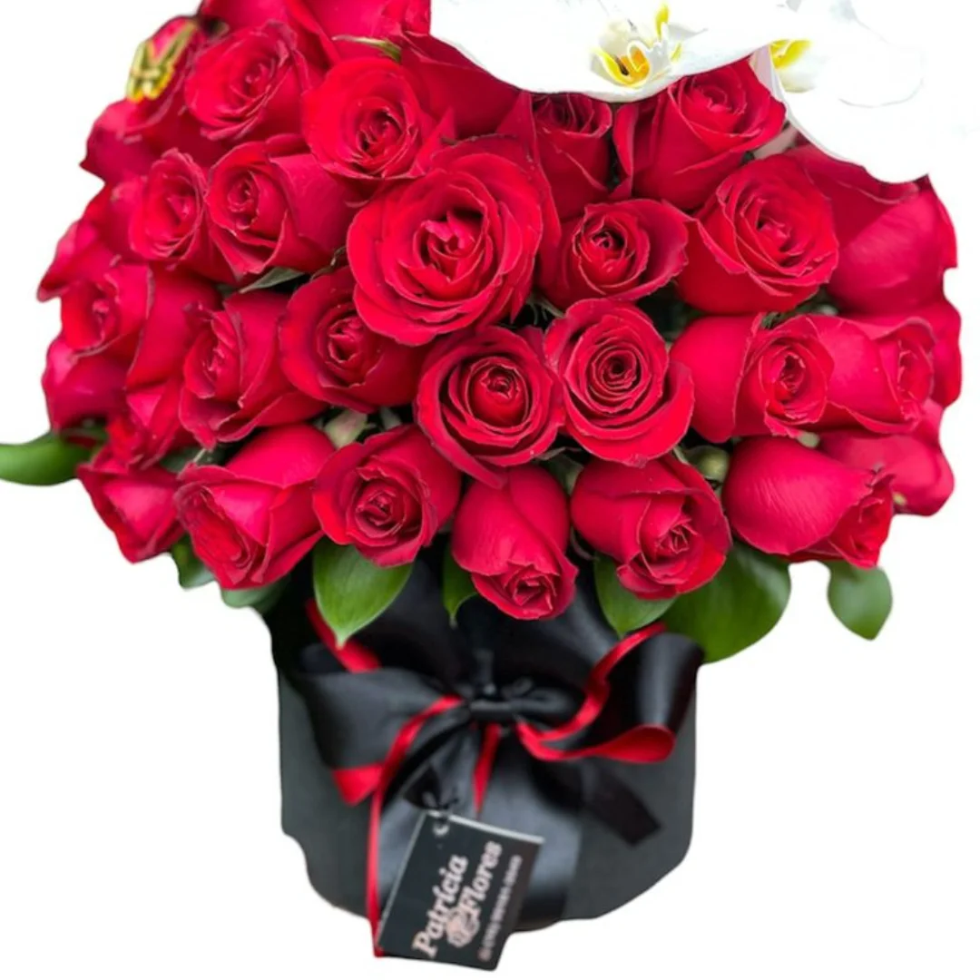 Box com 100 Rosas e 2 Flores de Orquidea