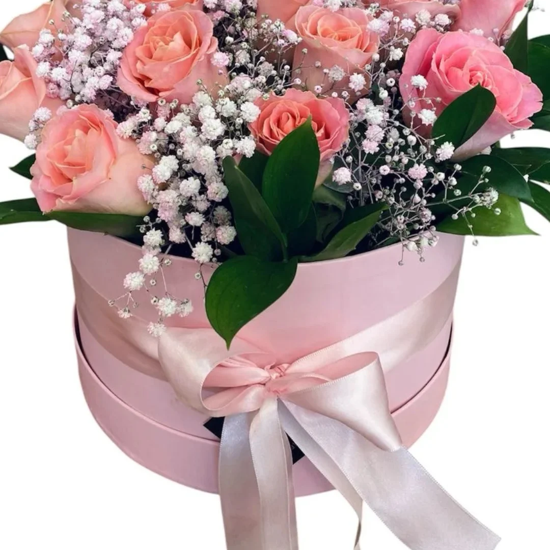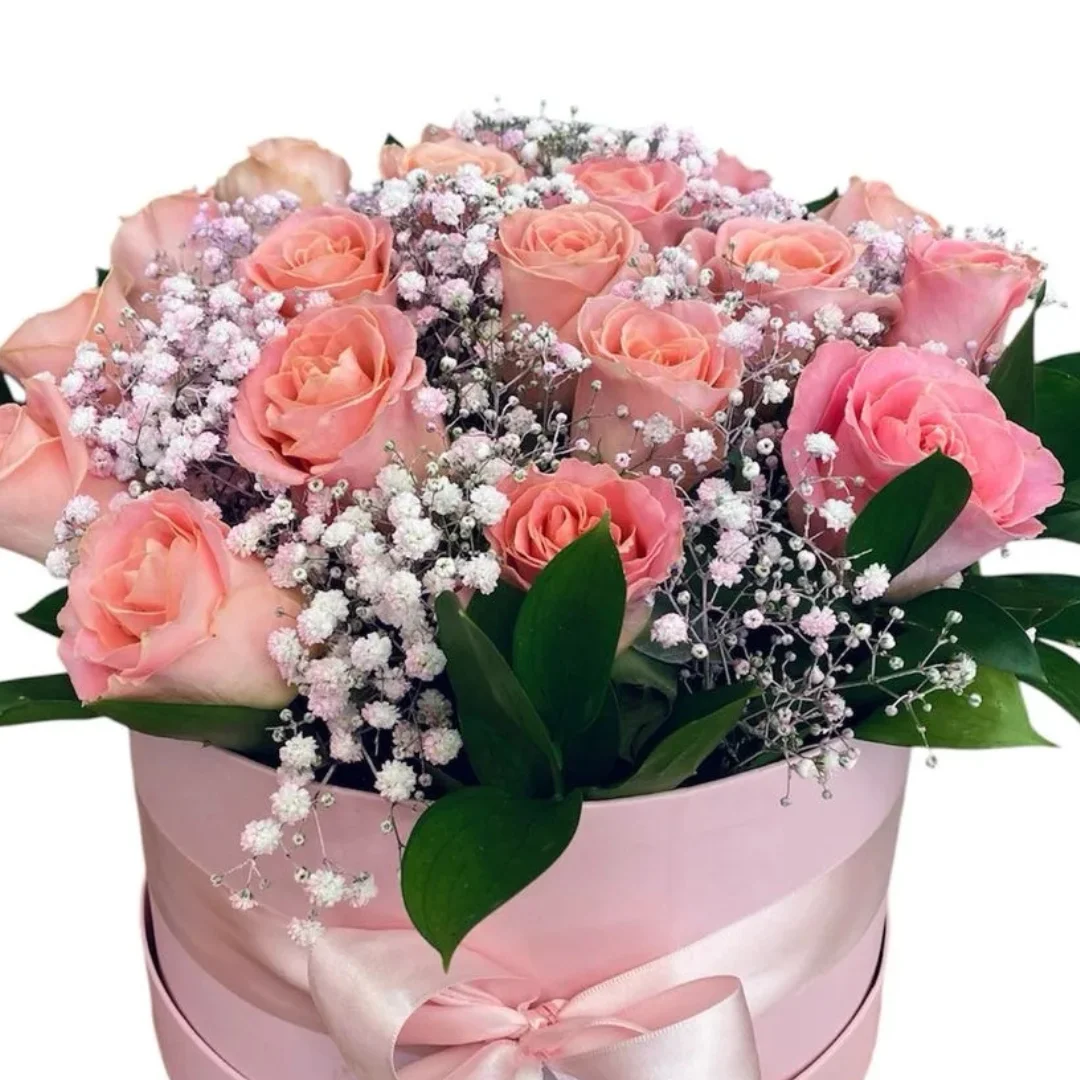 Box montado com aproximadamente 18 lindas Rosas cor de rosa , gypsofila cor de rosa e folhagem ruscos .