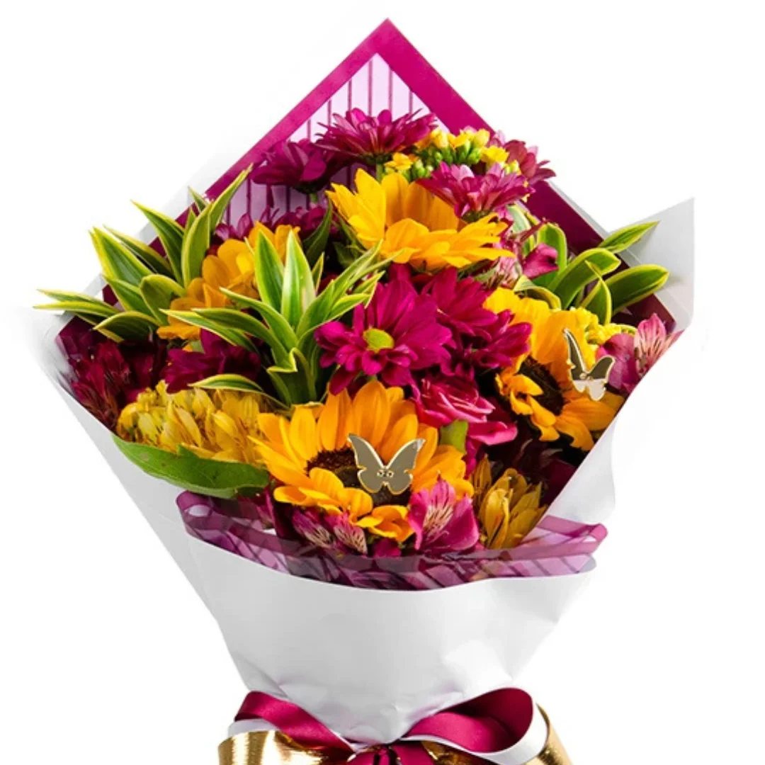 Buquê de flores montado com girassóis (aproximadamente 6 unidades), flores campestres e astromélias cuidadosamente embalado em papel especial.