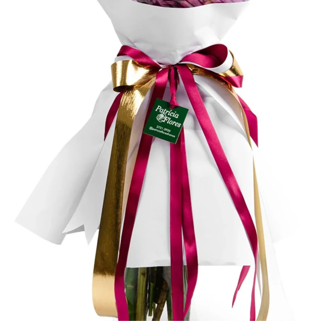 Um delicado laço em cetim confere um toque delicado ao arranjo que faz parte de nossa linha premium de produtos.