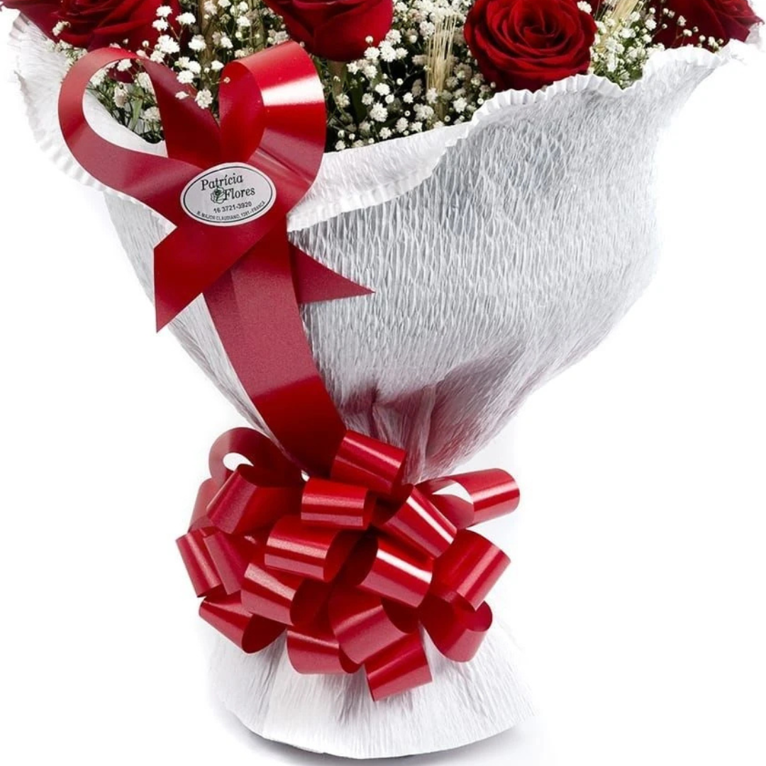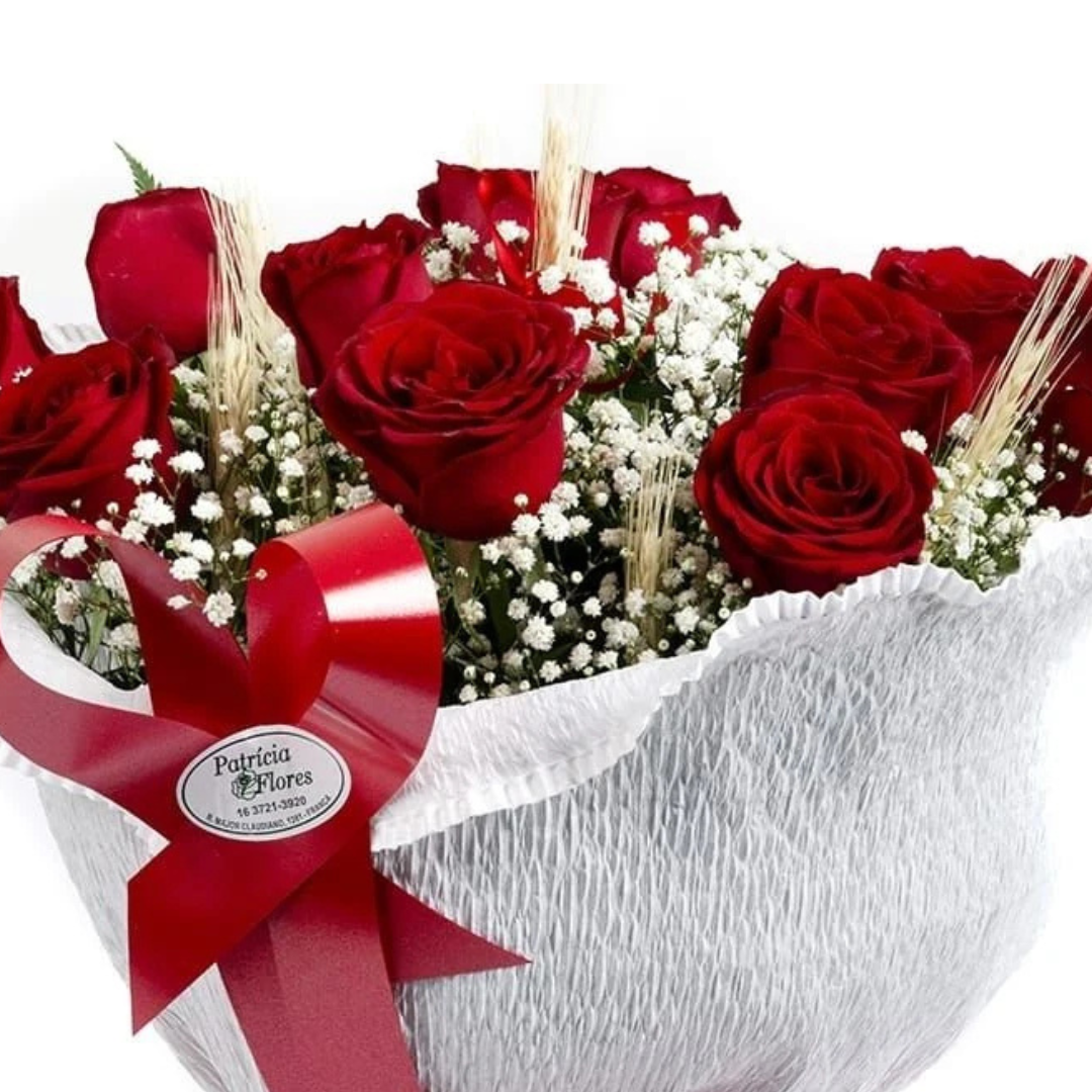Lindo Buquê com 12 rosas vermelhas, embaladas em papel crepom especial branco, laço e gipsofila.