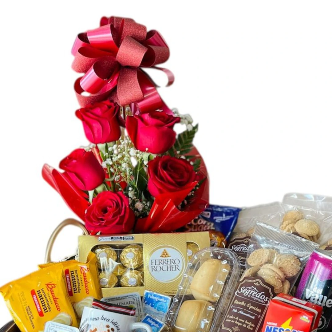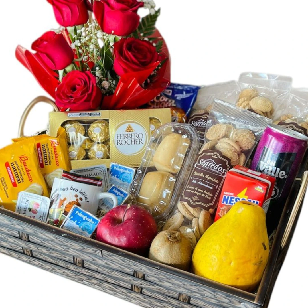 Cesta de café da manhã montada em bandeja de fibra sintética com balão personalizado.