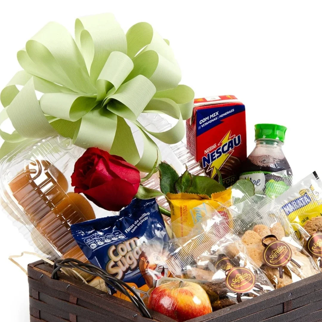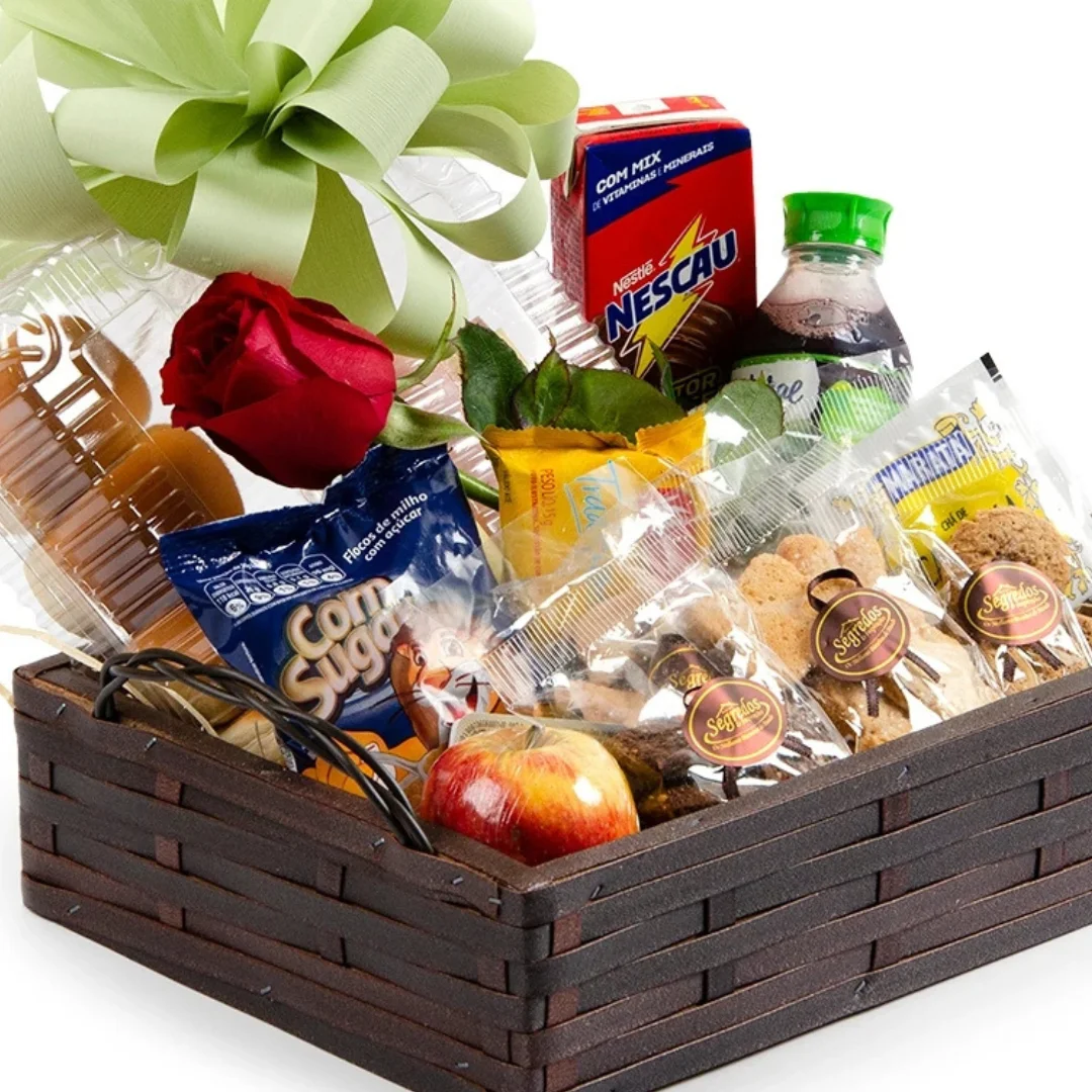 Cesta de café da manhã montada em bandeja de fibra sintética embalada para presente.