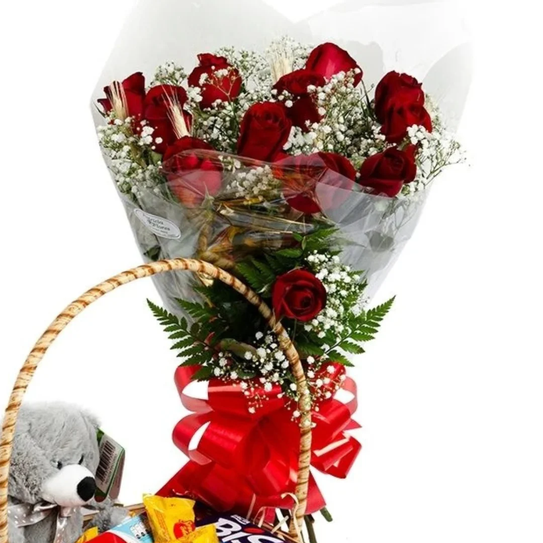 Acompanha pelúcia, buquê com 12 rosas e gipsofila embalados em celofane e laço.