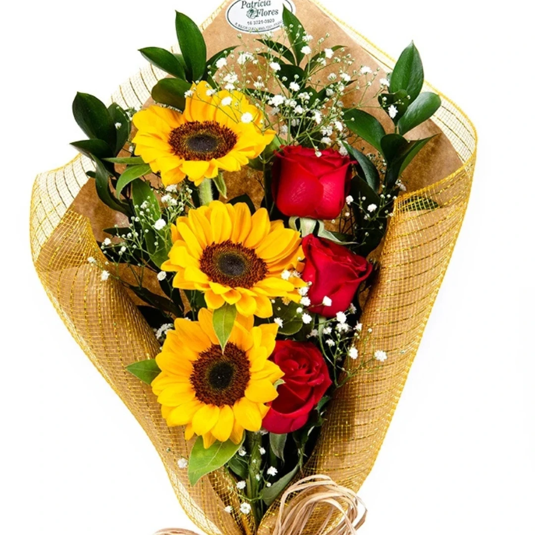 Buquê de girassol com rosas vermelhas (3 unidades de cada) e ruscus embalado em tela importada e laço de ráfia.