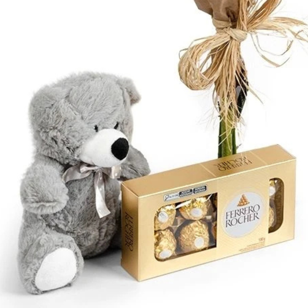 Acompanha urso de pelúcia e caixa de bombons Ferrero Rocher com 8 unidades.