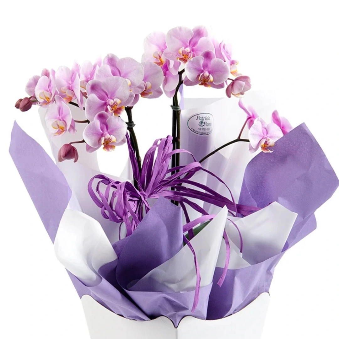 Vaso de orquídea phalaenopsis embalada em cachepot kraft e laço sintético.