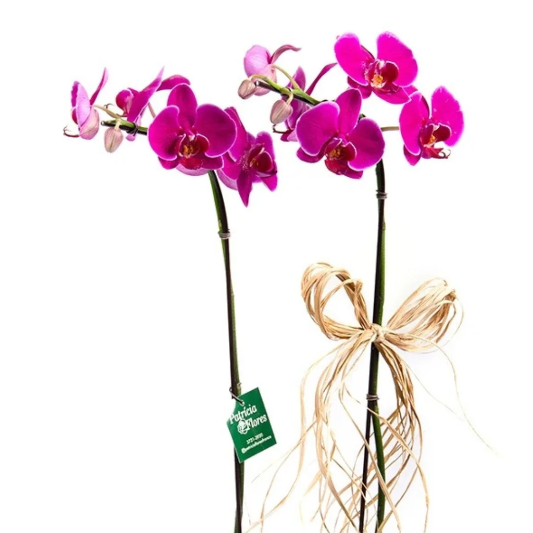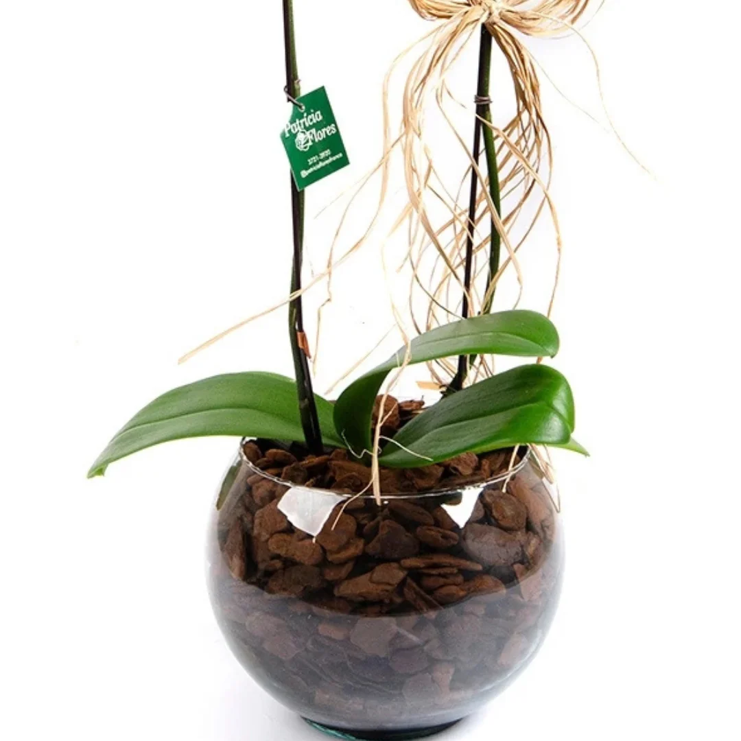 Vaso de orquídea phalaenopsis Marcelo Almeida embalada em cachepot de vidro e laço em ráfia.