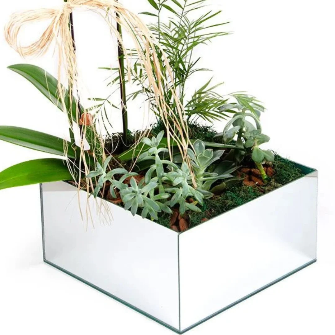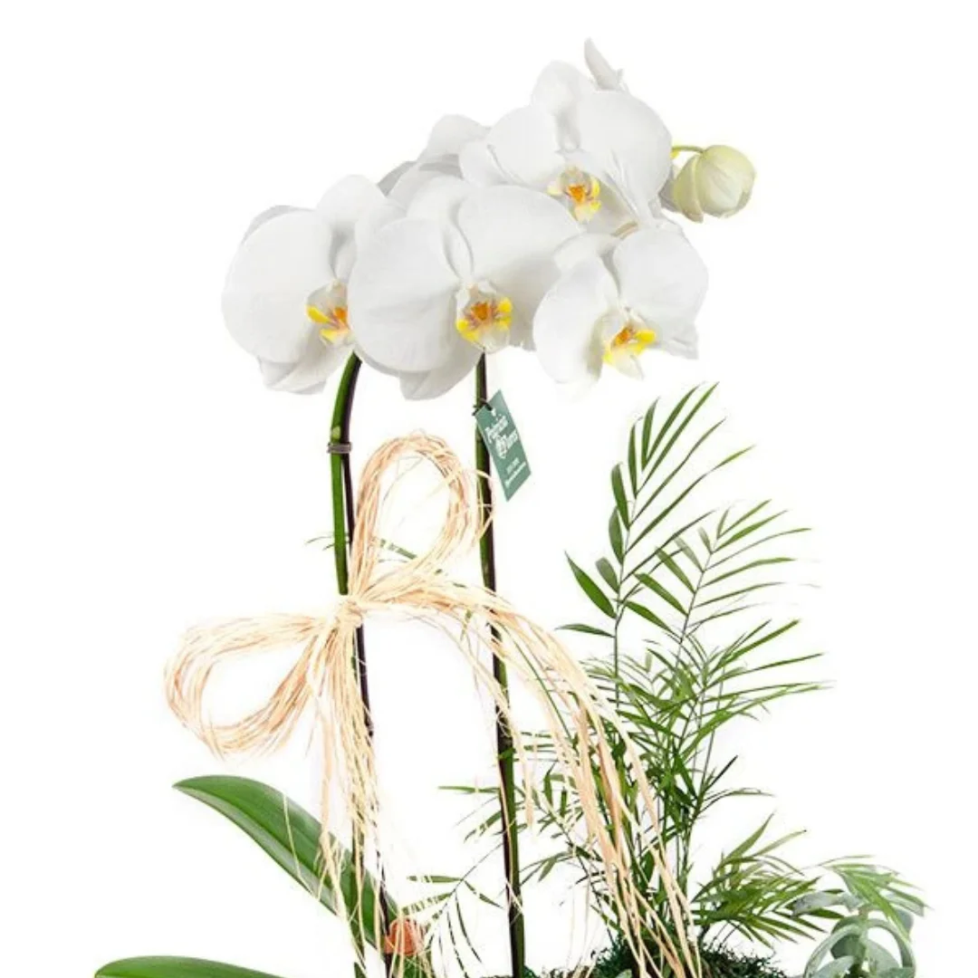 Vaso de orquídea phalaenopsis Marcelo Almeida embalada em cachepot espelhado, laço de ráfia e montagem de vegetativo com plantas simulando um jardim.